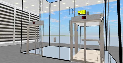 Two doubled doors and a revolving door were added to the entrance area, connecting the area with the (empty) mall. Also, buttons, floor indicator, hydro cylinder and even additional automatic doors just infront of the shaftdoor in the 2nd and 3rd floors were added to the Lutz hydraulic lift.